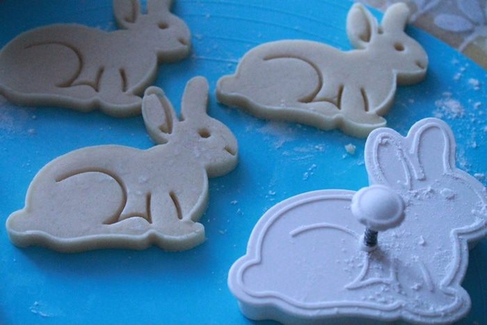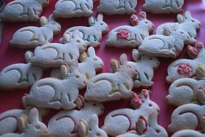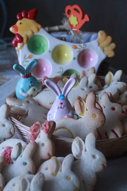 Украшать или нет - решайте сами. Несколько печений я украсила цветным сахаром, но мне показалось, что так кролики стали похожи на оленей, потом решила украсить сахарной готовой глазурью, а когда достала из духовки последнюю партию кроликов, решила оставить их так как есть- без украшений.
