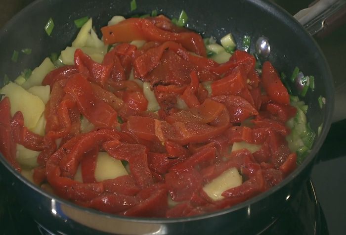 Консервированный перец нарезать полосками, выложить к картофелю с луком и все перемешать.