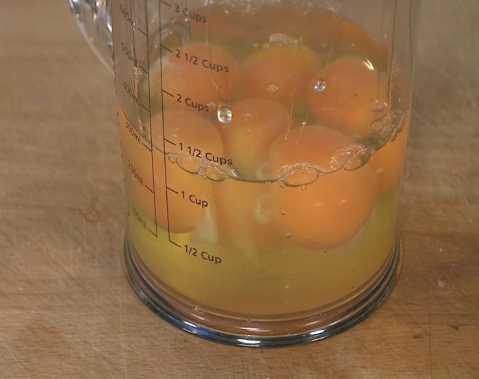 Яйца слегка посолить, поперчить и перемешать венчиком (но не взбивать!).