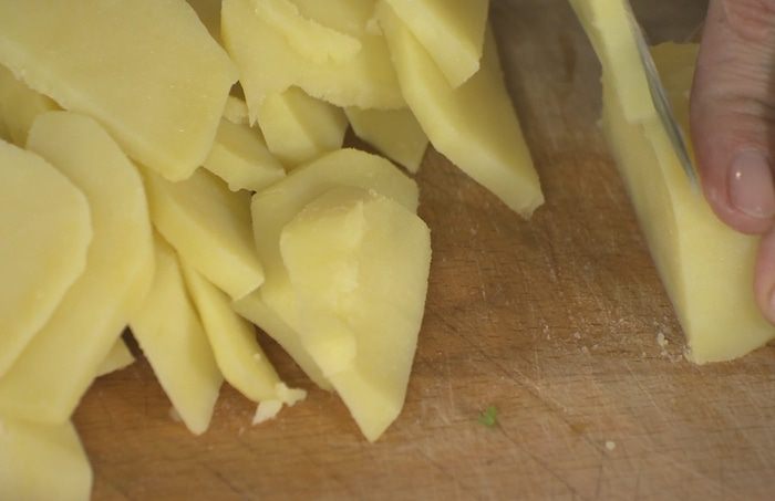 Картофель почистить, отварить, затем порезать тонкими ломтиками.