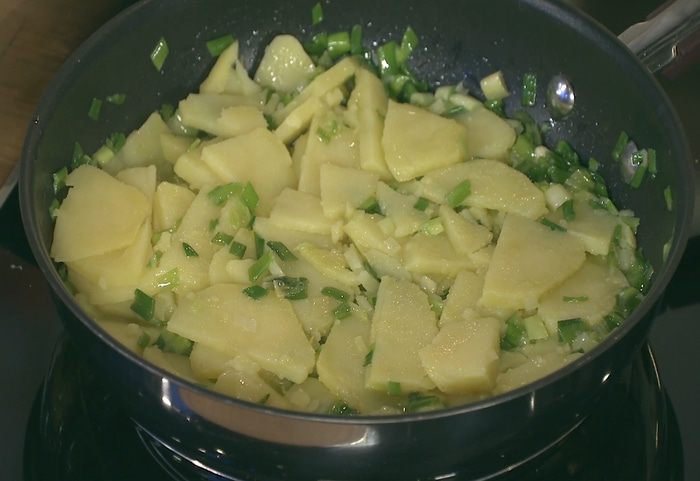 Если нет зеленого лука, возьмите порей или репчатый, а можно и вообще обойтись без лука, но картошка не будет такой вкусной!