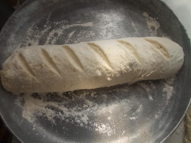 После того, как тесто увеличится в два раза, мы его снова замешиваем и формируем батон. Присыпаем мукой со всех сторон, делаем надрезы и даем постоять 20-30 минут. Пока разогреем духовку 190С.