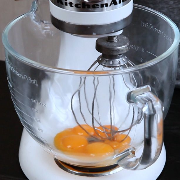 Взбить желтки в пышную массу, постепенно добавить горячую молочную смесь. Добавить сахар и взбить. Процедить полученную массу и разлить по формочкам.