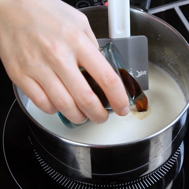 Нагреть в сотейнике сливки и молоко, добавить эспрессо.