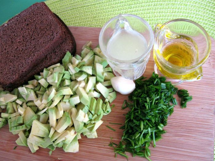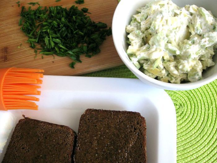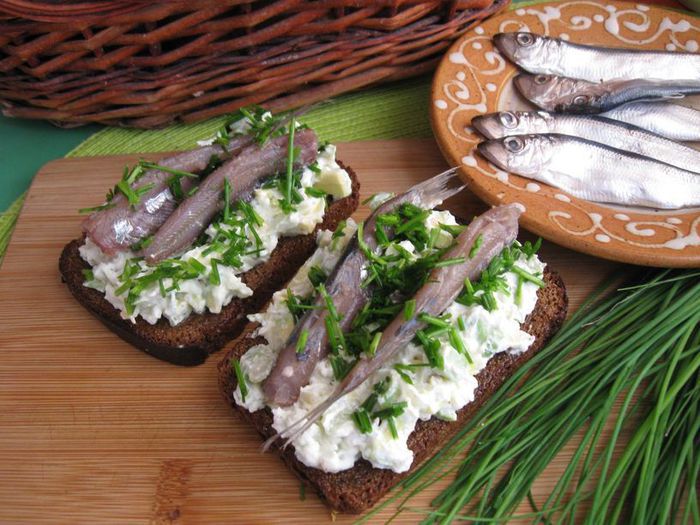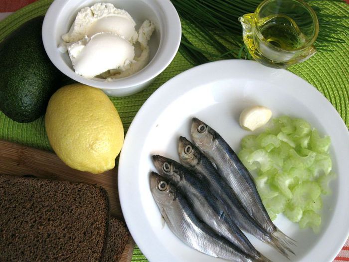 У кильки удалить голову и шкурку. Вчерашний хлеб хорошо поджарить на решетке в духовке (сковороде, СВЧ). Корку натереть чесноком. Удобно это делать, если срезать часть зубчика чеснока. Оливковое масло нанести кисточкой на плоскую часть хлеба. Оставшийся чеснок пропустить через пресс, добавить к смеси, перемешать.