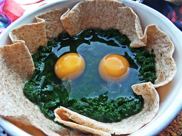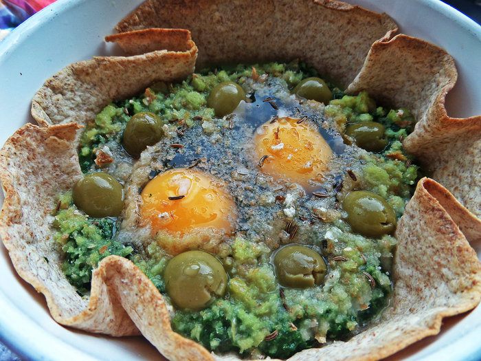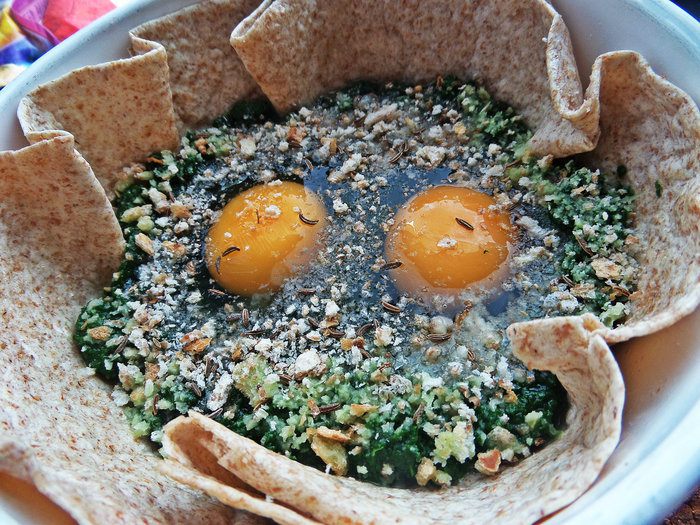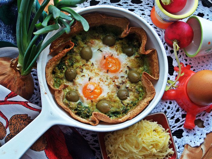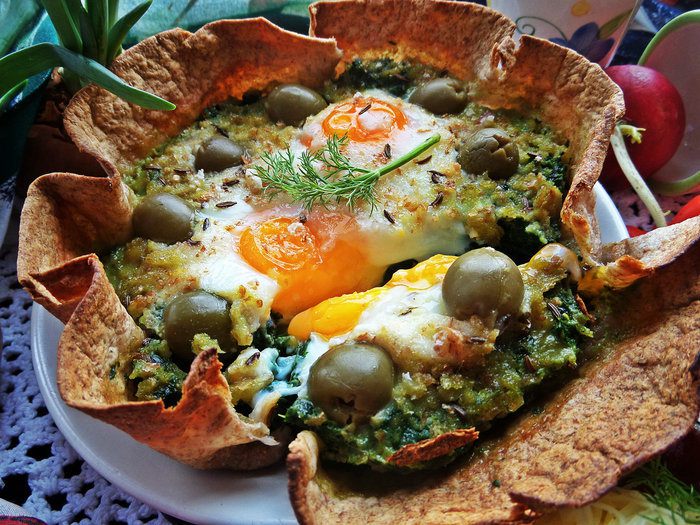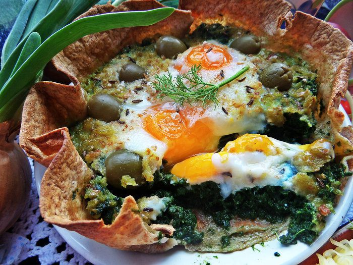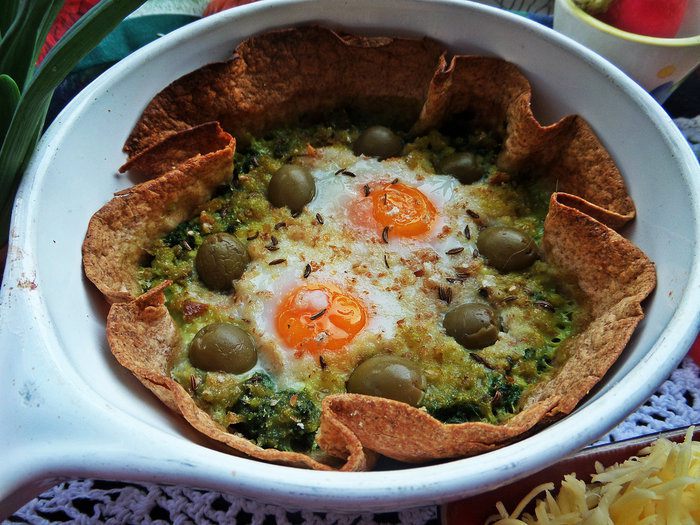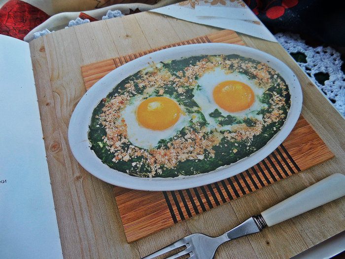 Недавно я получила книгу (спасибо сайту за пересылку в Латвию!) и тут же приготовила один завтрак по рецепту Юлии (в видео-рецептах он тоже есть за 2011 г), правда добавила съедобную "тарелку", оливки и шпинат вместо свежего, замороженный взяла!