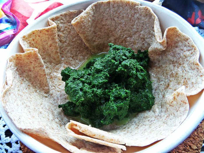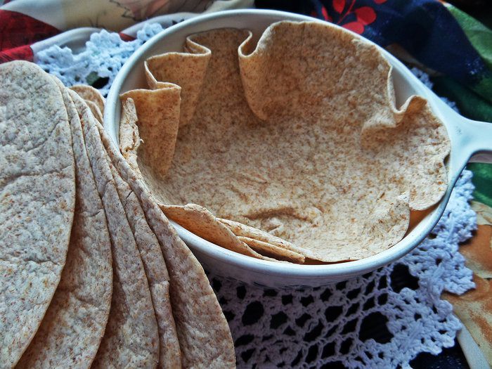 Цельнозерновую тортилью распределим по смазанной огнеупорной форме с высокими бортами. Края лепёшки я тоже смазала.