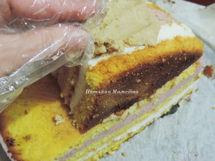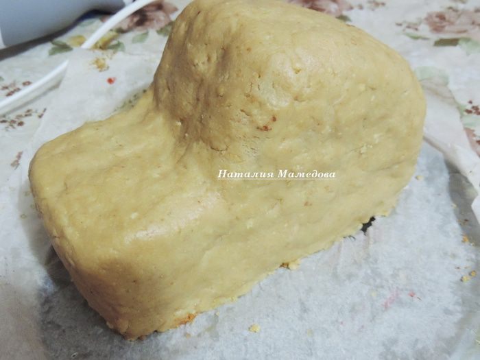 Затем к крошке добавляем сливочное масло и сгущенку. Их количество факультативно, я указала, сколько использовала масла, сгущенки добавьте примерно ложку, полторы. Ориентируйтесь по ситуации. Масса должна получится не слишком сухой, хорошо лепится, но не быть слишком влажной.