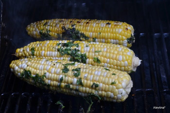 Смазать кукурузу со всех сторон. Готовим на разогретом гриле 10-20 мин под закрытой крышкой. Готовить можно и в фольге, закрыв кукурузу.