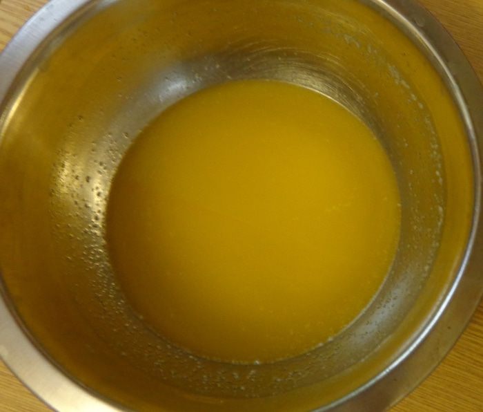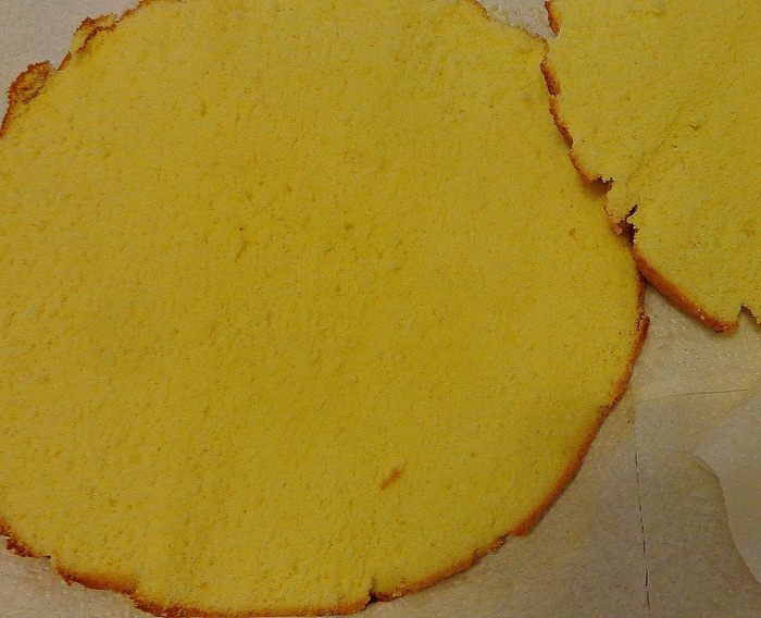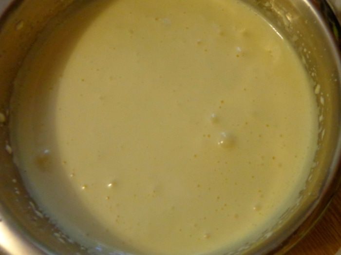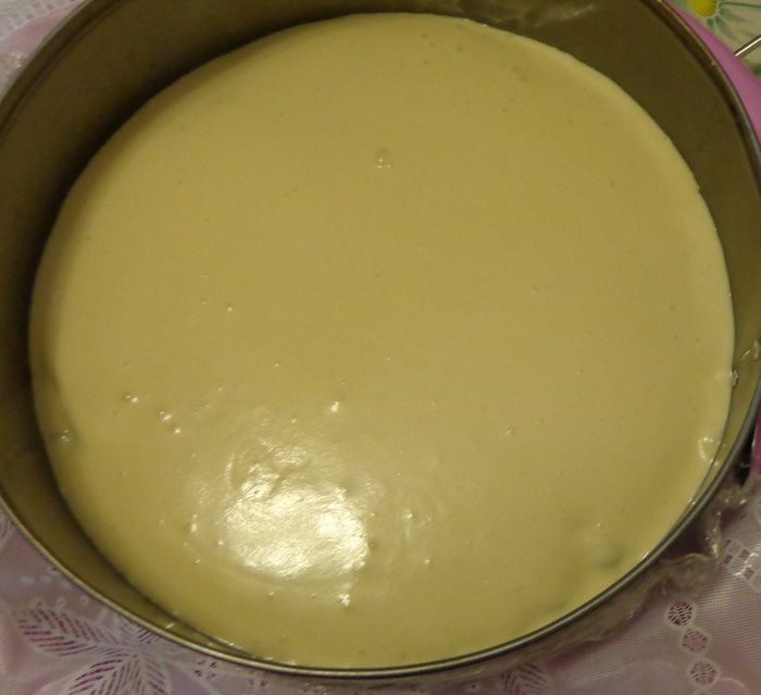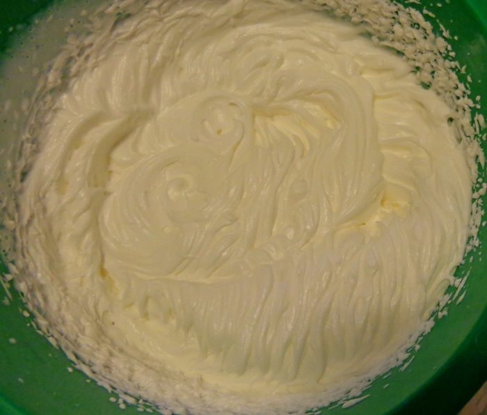 Итак, бисквит: миску разбить 4 яйца, добавить 3 желтка, 250 граммов сахара и 2 чайные ложки ванильного сахара. Поставить на водяную баню и, всё время перемешивая, нагреть до температуры 40 градусов Цельсия. Эту подогретую яично-сахарную смесь взбивать миксером на высокой скорости 10 минут. Затем во взбитую смесь просеять 250 граммов муки. Аккуратно, вручную, перемешать в одном направлении до получения однородного теста.