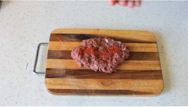 Рубим фарш из говядины, солим, перчим и приправляем молотым кориандром и паприкой.