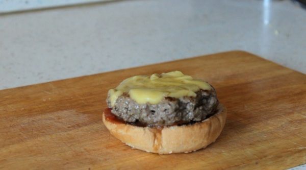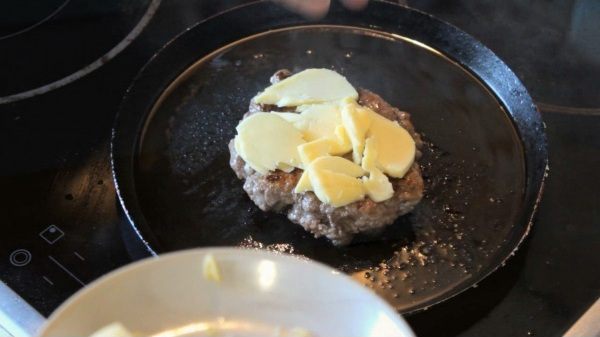 Формируем котлету на бургер и обжариваем с обеих сторон. В конце обжарки поверх котлеты кладем козий сыр, чтобы он подплавился.