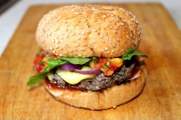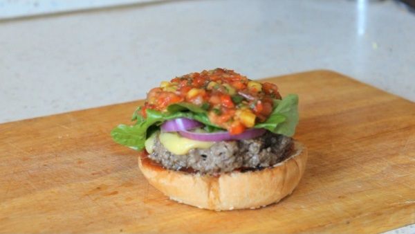 Мексиканский бургер с манговой сальсой и козьим сыром