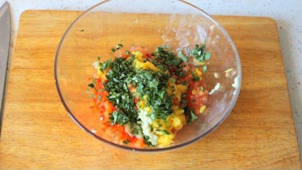 Делаем манговую сальсу. Мелко режем сладкий перец, кинзу и манго. Чеснок давим в пюре. С помидор снимаем кожу и мелко нарезаем. Все ингредиенты смешиваем и добавляем сок половины лайма. Манговая сальса у нас есть!)