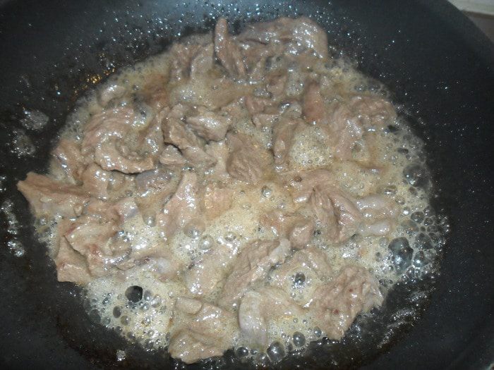 Добавляем приправы и вливаем 2 стакана бульона. Тушим на минимальном огне до готовности мяса, периодически помешивая. Приятного аппетита!
