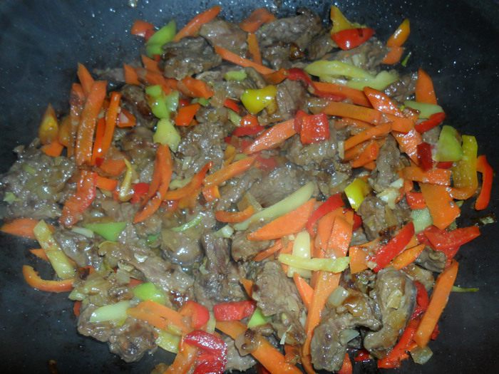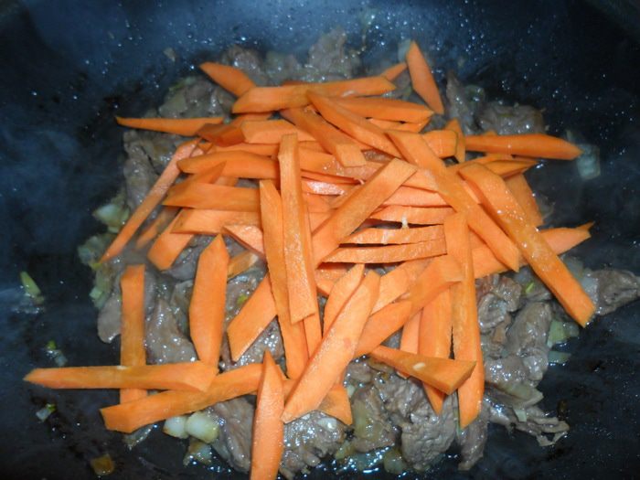 К обжаренному мясу с луком добавить крупно нарезанную морковь. Обжарить несколько минут.