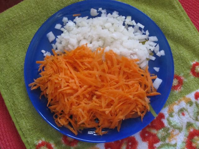 Морковь очистить, натереть на крупной терке. Лук очистить, нарезать мелкими кубиками.