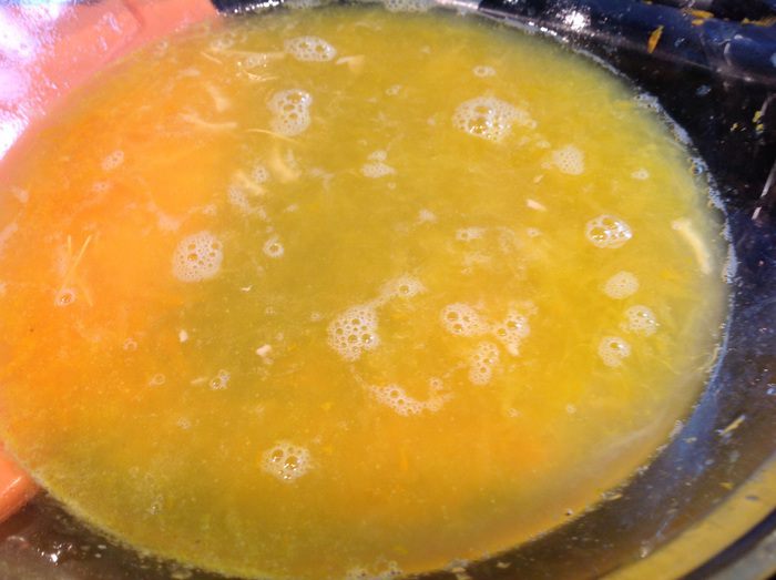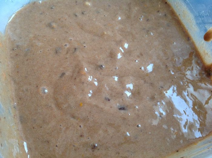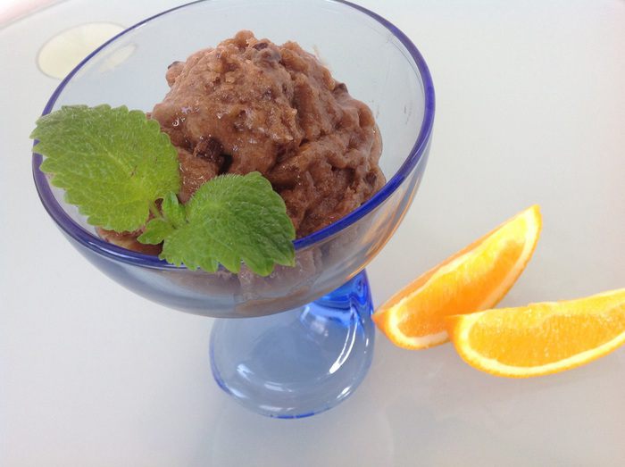 Смешайте в блендере до однородной массы охлажденные бананы, цедру и сок апельсина, мед и какао.