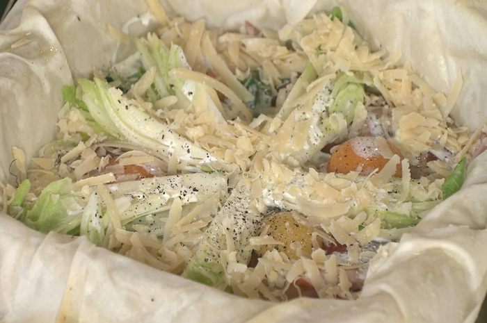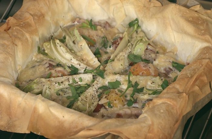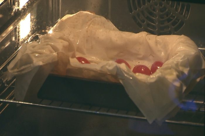 Отправить форму с тестом фило и помидорами в разогретую духовку на 5 минут.