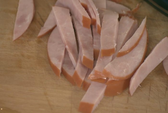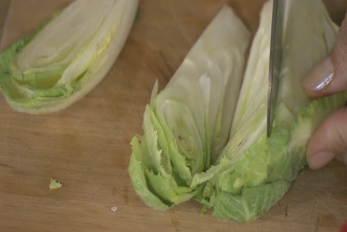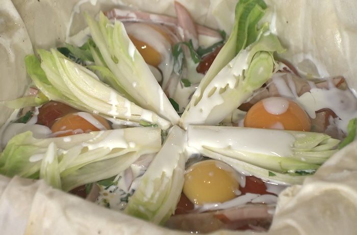 Подпеченное тесто с помидорами вынуть из духовки, выложить в форму ветчину, посыпать половиной зелени, разбить сверху яйца и полить все половиной сливок, затем выложить цикорий и сбрызнуть оставшимися сливками.