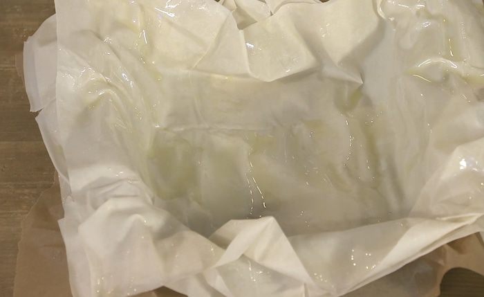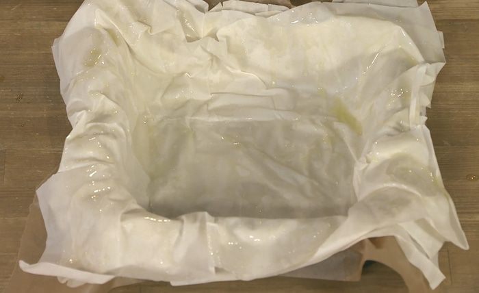 Сверху выложить оставшийся лист фило и смазать только края теста — середину смазывать не нужно.