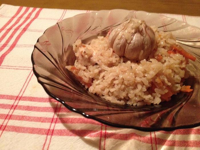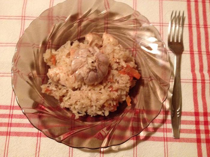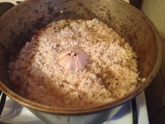 Заложить рис. Добавить специи. В середину положить целую головку чеснока.