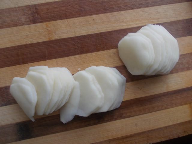 Картофель порезать пластинками. Можно порезать ножом очень тоненько, а можно воспользоватся шинковкой для капусты.
