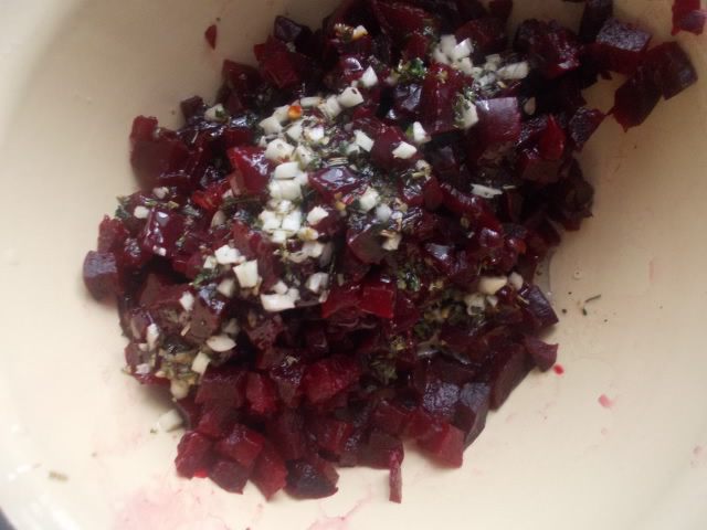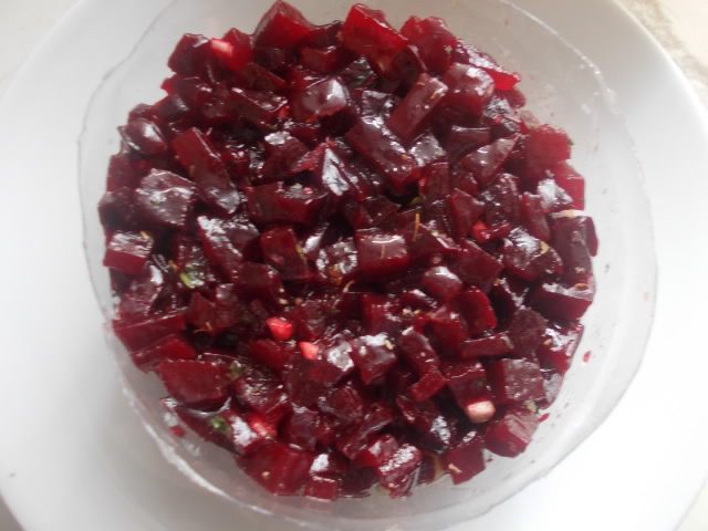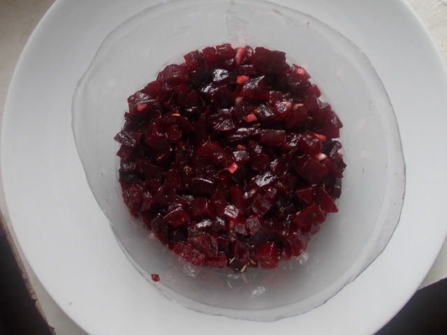 Свеклу сварить, порезать кубиком и заправить нашей заправкой.