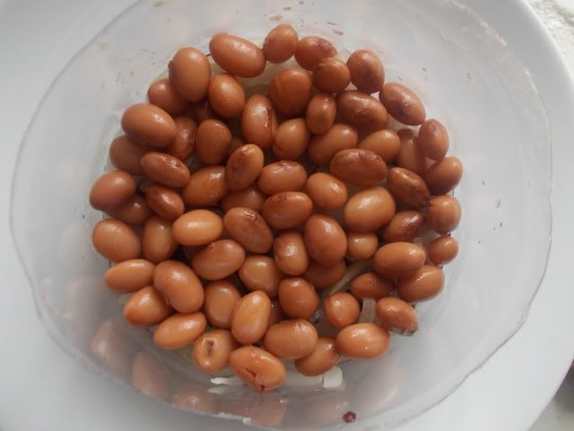 Фасоль сварить до готовности. У меня мелкая фасоль "лимонка". Когда она сырая, то цвет желтый, а когда сварится - становится коричневой.