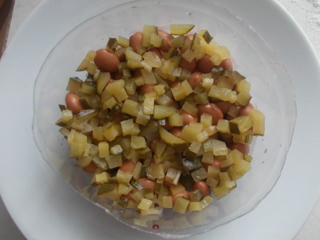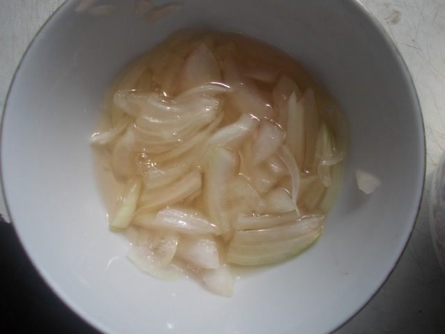 Лук порезать полукольцами или кубиком и замариновать в уксусе или залить кипятком, чтобы ушла лишняя горечь.