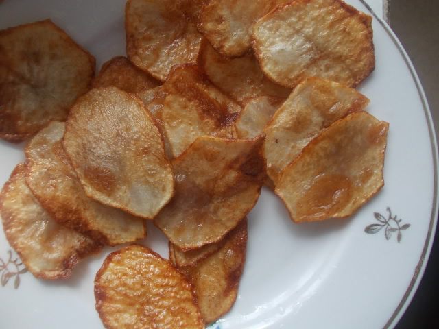 Раскалить масло и пожарить картофель во фритюре. Просушить салфеткой от лишнего масла. Можно использовать покупные чипсы, но домашние более полезные.
