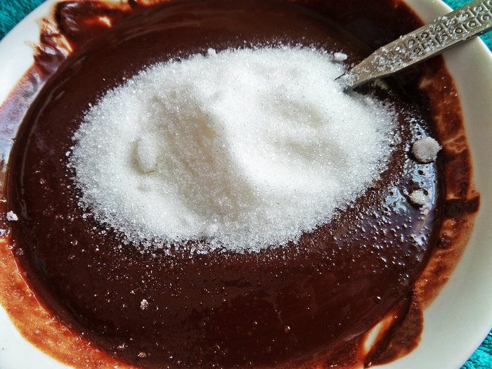 Всыпаем сахар. Сахара в оригинале нужно 140 гр, но я уменьшила почти на треть, а Вы решайте сами.