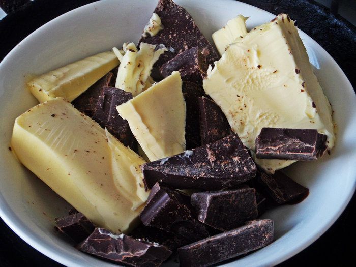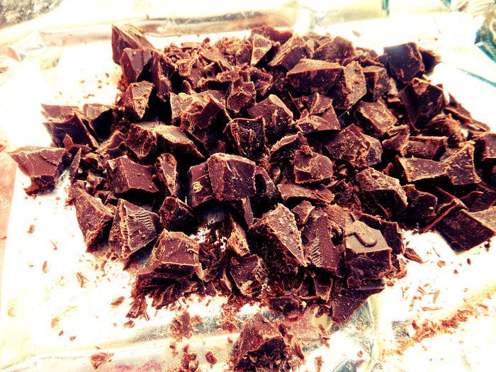Шоколад (50%) теперь уже мелко нарубить (но не в крошку). Идея! Если взять шоколад с орешками, то и начинка станет богаче :)
