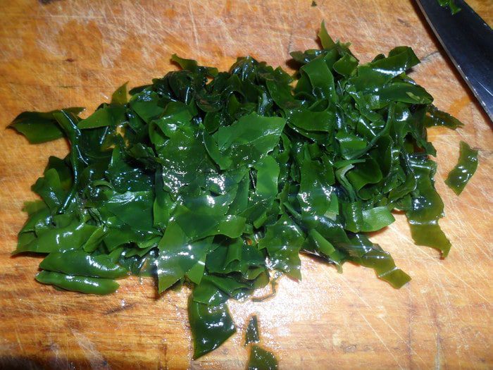 Водоросли отжимаем и нарезаем.