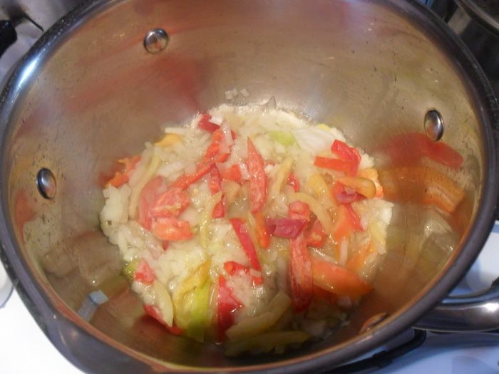 В кастрюле с толстым дном на кунжутном масле обжариваем 3 минуты лук-порей и болгарский перец.