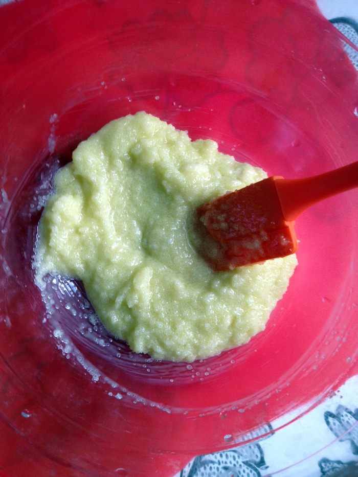 Тщательно размешать сливочное масло, оливковое масло и сахар.