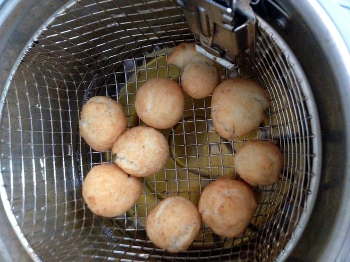 Жарить шарики в растительном масле при температуре 160 градусов, пока не всплывут на поверхность.