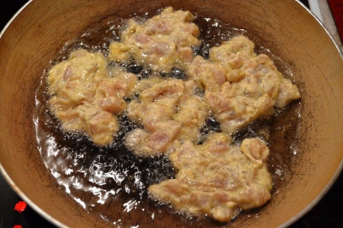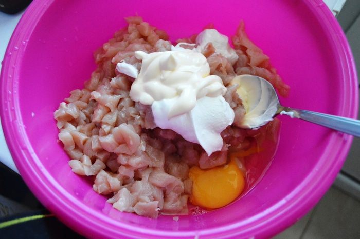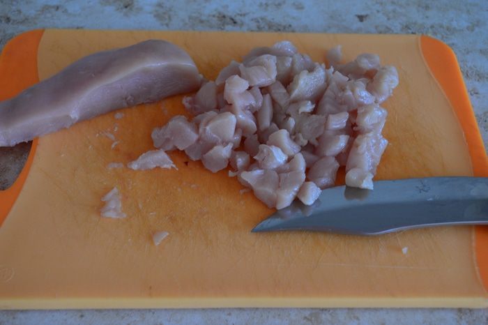 Промытые куриные грудки рубим мелким кубиком (проще и быстрее резать, если предварительно слегка приморозить мясо в морозилке ~15 минут).