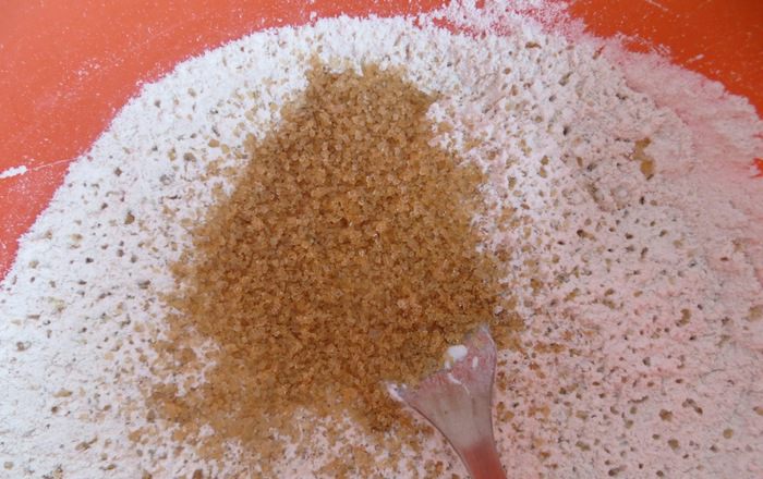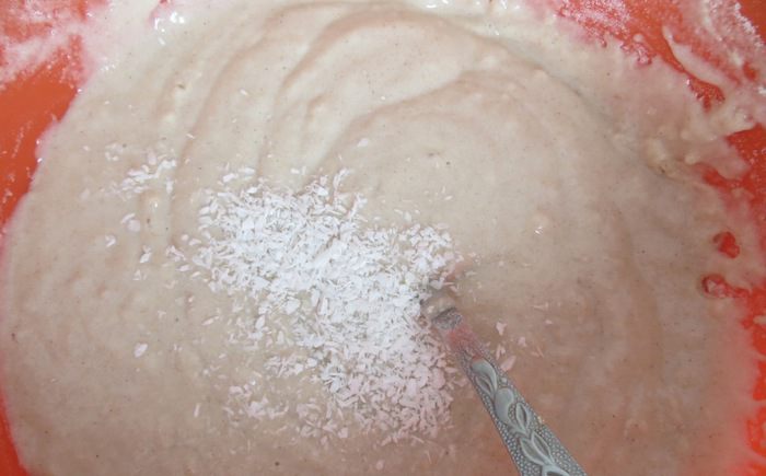 Добавляем жидкую составляющую. Воду и масло. Я еще добавила кокосовую стружку. От этого рецепт только выиграл :)