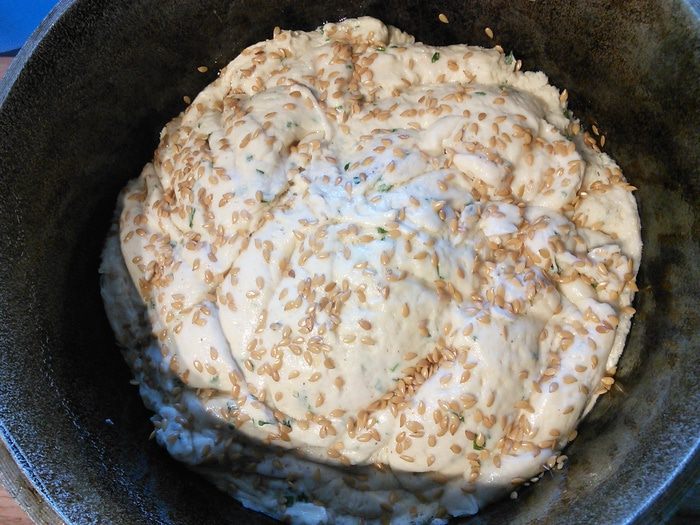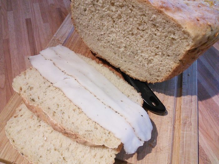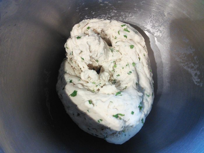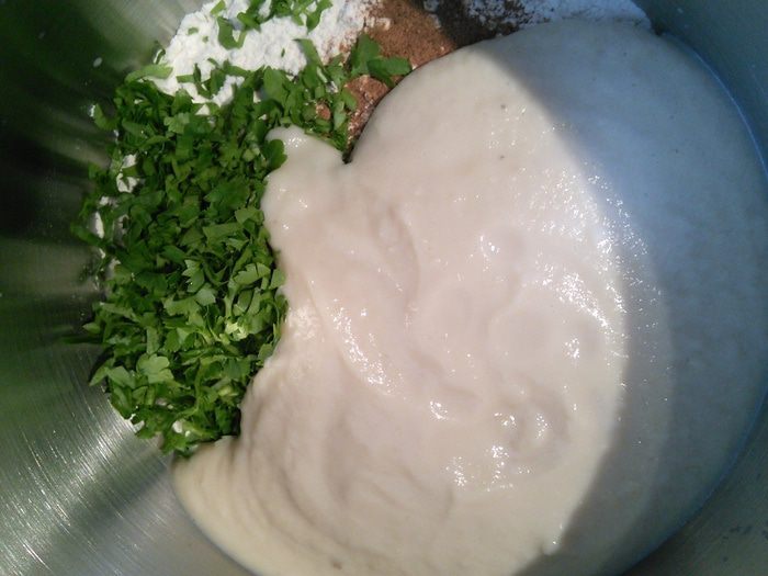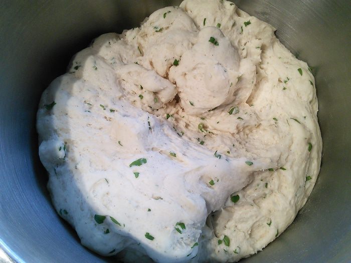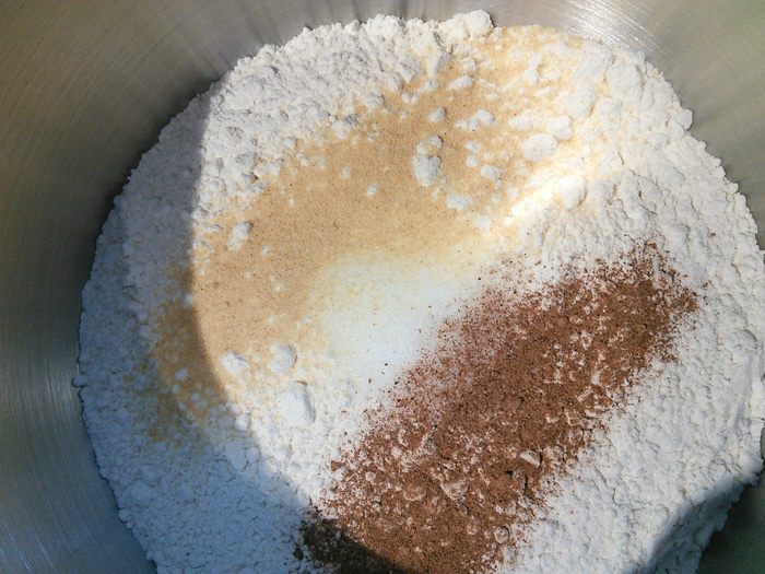 Просейте в чашу комбайна муку, добавьте соль, сухой чеснок, мускат. Мускат- специя специфическая, если она вам не нравится, удалите её, если решите все-же добавить, то не переборщите, в готовом хлебушке мускат чувствуется довольно интенсивно.