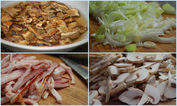 Сушеные грибы залить 1,5 стакана кипятка и оставить на 30 минут. Белую часть порея нарезать полукольцами, шампиньоны – тонкими пластинками, бекон – соломкой.