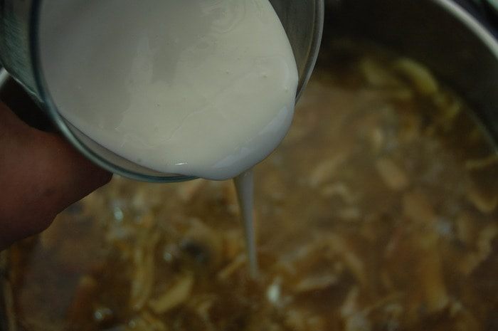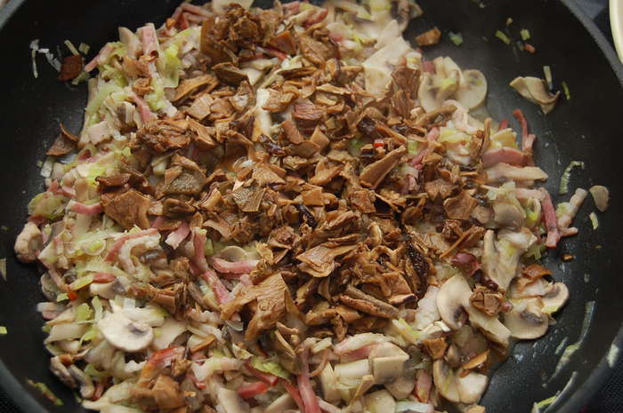 Воду, в которой замачивались грибы процедить через сито и марлю. Этот грибной бульон понадобится нам! Грибы произвольно нарезать и добавить в сковороду. Обжаривать еще 3-4 минуты на тихом огне.