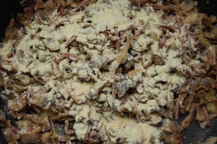 Содержимое сковороды присыпать мукой, тщательно перемешать. Подержать на тихом огне еще 3 минуты.