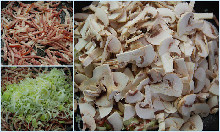 Разогреть сковороду с небольшим кол-ом оливкового масла. Обжарить бекон. Добавить грибы и порей. Готовить на огне выше среднего до полного испарения жидкости от грибов (около 10 минут).