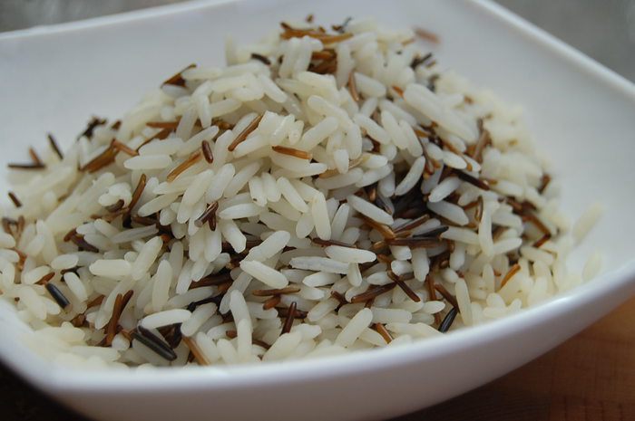 Рис (у меня смесь белого и дикого) тщательно промыть, залить водой (соотношение 1:2), отварить на 10 минут меньше, указанного на упаковке времени.
