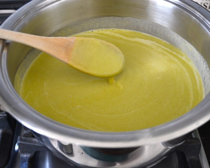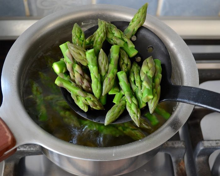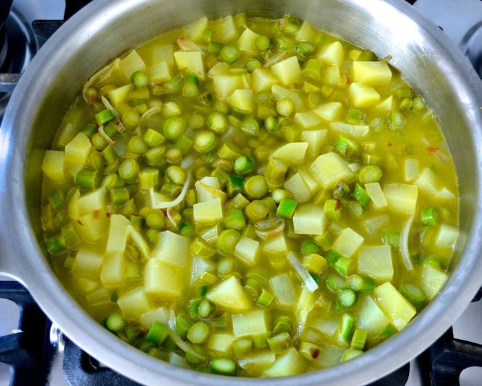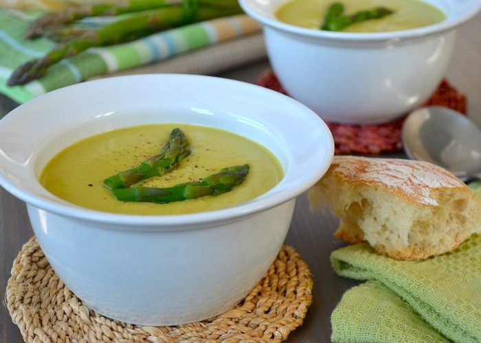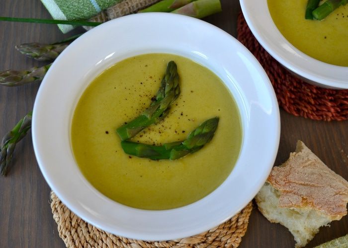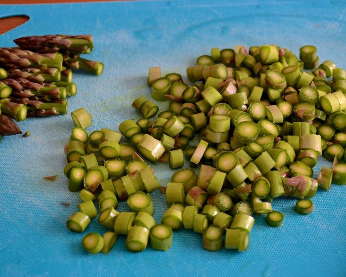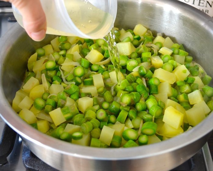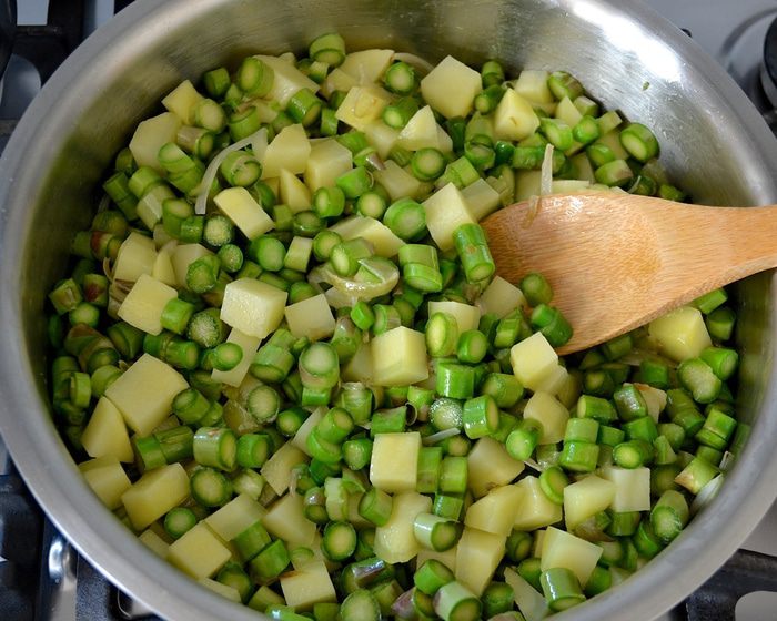 Начнем с подготовки овощей! Картофель очистить и нарезать небольшими кубиками. Спаржу тщательно промыть, чтобы удалить остатки земли. Самую нижнюю и более грубую часть стебля отрежьте или отломите руками (она поломается именно в том месте, где нужно!). Отрежьте самую верхнюю часть спаржи (1,5-2 см) и отложите в сторону, она потребуется для украшения уже готового супа. Остальную часть стебля нарежьте кружочками.