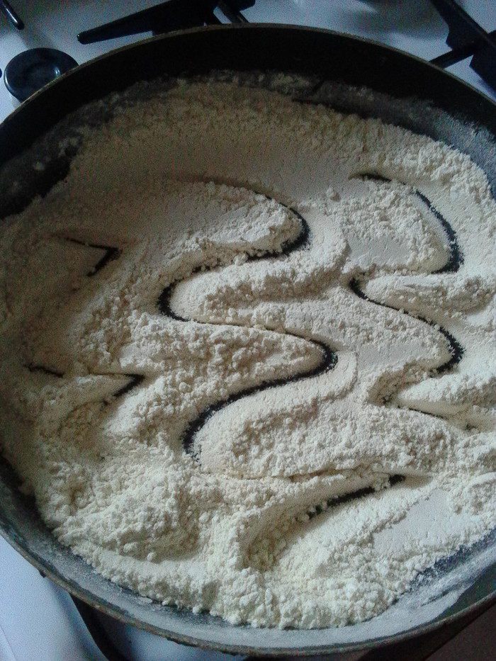 Муку обжарить на сухой сковороде до изменения цвета и появления характерного орехового аромата.
