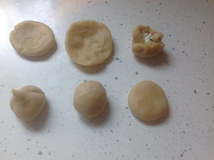 В это углубление положить примерно 0,5 ст.ложки начинки. Защипать края к середине, стараясь не сильно надавливать на само изделие, как бы оставляя внутри пространство. Перевернуть поачу швом вниз и еще раз хорошо скатать в руках. Формируем булочку круглой или овальной формы, слегка приплюснув. Разделку теста удобнее производить в ладонях, а не на столе. Таким образом внутри получится начинка с небольшим количеством воздуха.
