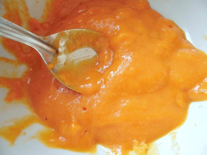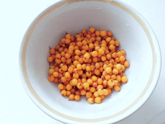 Облепиху тоже смолоть в мясорубке или в блендере, затем обязательно протереть через сито! Честно говоря, я не знала, что в ней есть косточки, поэтому меня ожидал неприятный сюрприз... Хочу предупредить, что облепиху нужно обязательно измельчать ОТДЕЛЬНО от кураги, затем протереть через сито и тогда уже смешивать с курагой! Я же сначала измельчила курагу, затем облепиху, потом еще пару раз пропустила все через мясорубку. И, когда я начала протирать курагу через сито, мне попадались кусочки неизмельченной кураги, которые застревали в сите... Но после долгих стараний получилось вот такое однородное облепиховое пюре.