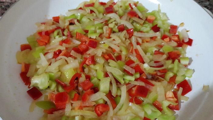 Репчатый лук режем на четверть кольца и обжариваем на оливковом масле до мягкости. Перцы режем кубиками и отправляем к луку, тушим на небольшом огне до мягкости перца.
